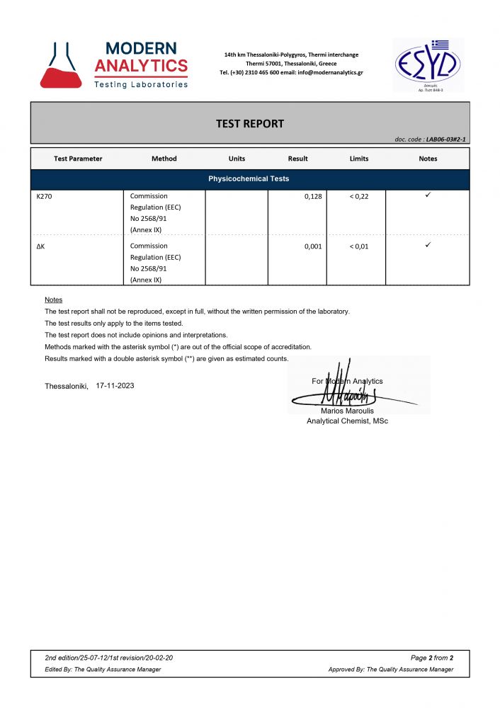 Produsul obtinut este un ulei de masline extra virgin echilibrat, cu aciditate scazuta, pastrand o culoare verde stralucitor si avand exceptionale caracteristici organoleptice.